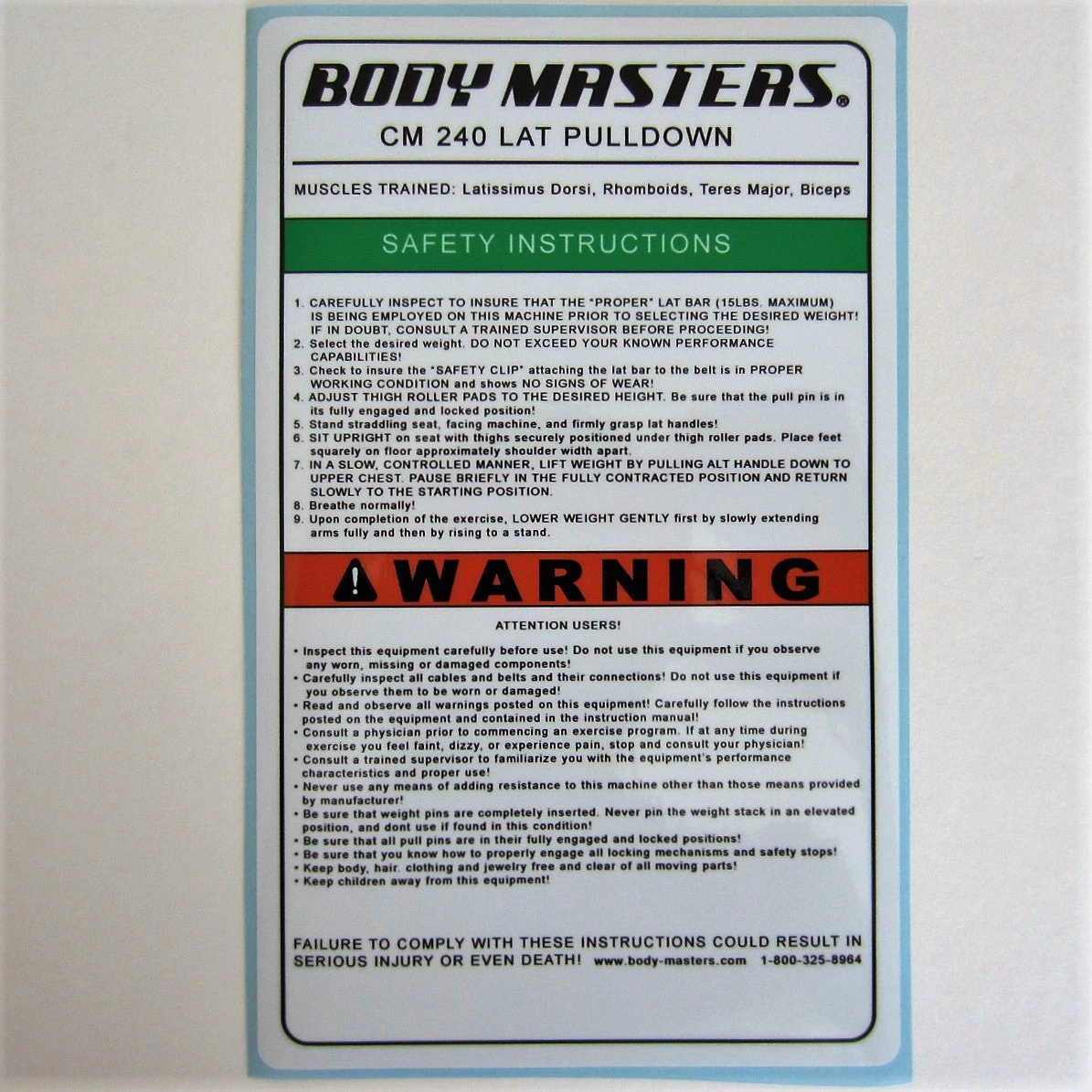 Body Masters CM 240 Lat Pulldown Instruction Decal